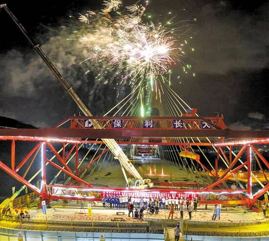 珠海洪鹤大桥洪湾水道主航道桥合龙,工作人员燃放烟花庆祝 |