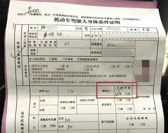 新的体检表显示:陈某视力正常,但辨色力有红绿色盲 |