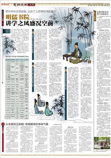 统筹策划/陈骁鹏 马勇 作者/徐志达 吴定球 何志成 明代办书院的高潮,肇始于明嘉靖初年,并以一发不可遏止之势延至万历后期,历时几近百年。这一高潮,以湛若水、叶春及等名儒在惠