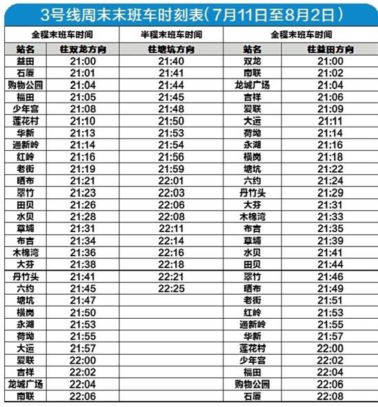 羊城晚报讯 记者李天军报道:记者8日从深圳地铁获悉,为配合新线开通,7月11日至8月2日的每周六、周日,深圳地铁3号线将于21时提前结束运营。其他地铁线路正常运营。