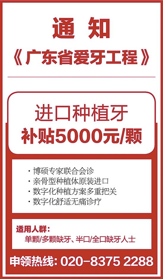 缺牙危害大,补救要及时 很多人觉得缺一两颗牙没什么,然后慢慢地缺失的牙齿会越来越多,甚至导致无牙颌的现象。广东省口腔医学会口腔种植专委会常委、中华口腔医学会口腔种植专委会常委、德伦口腔集团医疗副总裁兼东风总院技术院长徐世同提醒道:“缺牙要及时补救,因为牙齿是互相依靠并排站的,缺了一颗牙,旁边的牙齿会失去依靠而长歪,牙齿长歪以后,邻牙和旁边的牙之间的缝隙变大,容易塞牙,进而导致蛀牙、牙周病、牙槽骨吸收,旁边的牙齿也会逐渐松动、脱落!” 古稀老人种新牙,晚年享口福 79岁的陈伯伯一直饱受缺牙的困扰,全口仅剩寥寥几颗牙齿,脸颊凹陷更显苍老,讲话口齿不清阻碍日常交流,缺牙咀嚼吃饭都成问题,导致身体因营养不良而日渐消瘦、精神不振。 家人对此十分着急,多方寻医问诊终于来到了德伦口腔看牙。 经过一系列口腔检查及德伦口腔博硕口腔专家的联合诊疗,为陈伯伯量身定制了数字化亲骨型无牙颌即刻修复种植牙方案,重建全口新牙。 广东省惠民看牙补贴正式发放 “广东省爱牙工程”是由广州广播电视台《G4出动》主办、广东省临床医学学会协办、广东省老年基金会为指导单位,德伦口腔为承办单位及唯一技术指定单位的援助活动,为让更多市民“看好牙,易看牙”,推出系列补贴政策,拨打020-8375 2288申领补贴: ● 5000元/颗进口种植体补贴 ● 9000颗明星时尚美牙1折起 ● 8000元起矫牙补贴 ● 10元购德伦口腔【全家福卡】