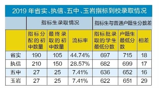 而五中、玉岩的流标率则低得多,两者的指标都是分配给27所初中,其中25所初中都有录取,流标率只有约7%。