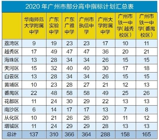 记者查询数据显示,在省属、市属国家级示范性高中各校指标计划方面,华南师范大学附属中学137个,广东实验中学310个,广东广雅中学366个,广州市执信中学364个,广州市第二中学416个,广州市第六中学364个,广东华侨中学250个,广州市协和中学260个,广州大学附属中学288个,广州市铁一中学(越秀校区)158个,广州市铁一中学(番禺校区)165个。