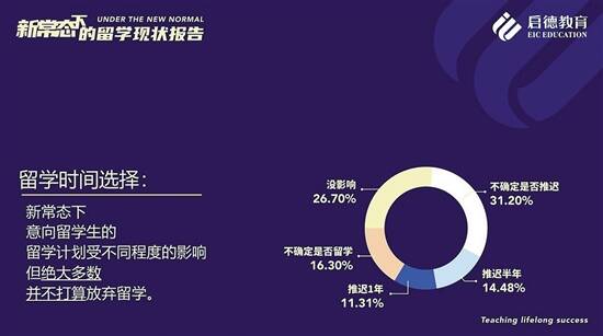 在疫情与国际环境叠加的“新常态”中,意向留学生的留学计划不同程度地受到影响,但大部分的意向留学生并不打算放弃留学,而主要是在时间规划上进行了调整。7月18日,启德教育发布的《新常态下的留学现状报告》(以下简称《报告》)显示,参与调研的意向留学生中,31.2%表示不确定是否推迟留学计划,26.7%表示没有影响,14.48%将留学计划推迟半年,11.31%将留学计划推迟一年, 16.3%表示不确定是否继续留学。