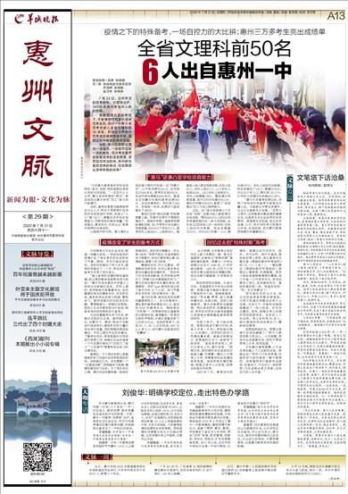 羊城晚报:今年惠州一中高考情况是否符合预期?近年来一中高考成绩呈现什么趋势? 刘俊华:今年一中高考成绩各项指标节节攀升,1010人上高分优先投档线(包括音体美、港澳台生),正取生优投率90.59%,正取生本科上线率100%;尖子生技压群雄,全省文理科前50名共6人,名列广东省第四;名校录取率再创新高,10人以上有望被清华大学、北京大学录取。今年高考取得的成绩符合学校预期,特别是理科成绩高分段尖子生超出预期。近年来理科有上升趋势,文理齐头并进。 羊城晚报:一中如何推动惠州优质资源均衡发展,助力惠州打造一流教育? 刘俊华:一中充分发挥好全市基础教育标杆示范作用,辐射带动新建或薄弱学校发展,为促进全市教育均等发展作出贡献。特别是在2018年4月成立了惠州一中教育集团,集团规模不断壮大,涵盖了博罗、惠东、惠城、仲恺等多个县区共8所学校,贯彻“四同”举措,即同管理、同教研、同评价、同结对,扩充优质教育资源。2011年以来,还对仲恺中学和大亚湾一中进行帮扶,让更多孩子在惠州“读好书”。 羊城晚报:惠州民办学校异军突起,公办学校应该如何正确应对?对于惠州高中教育形成有序竞争的发展良好态势,您有什么意见和建议? 刘俊华:民办教育的发展是对公办教育的补充,公办学校应乐见其成,并以此为动力,强化内功。每所学校要明确自己的定位,办出自己的特色,不要恶意竞争,这是惠州教育有序发展的前提。