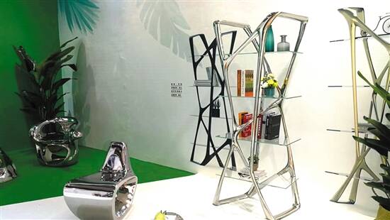 一直主打原创设计产品的迪谱家居,本次展出了一款极具网红相的不锈钢书架,在设计师的巧妙设计下,原本给人笨重感的不锈钢变得轻盈灵动。“这个高度不到2米的书架,卖5万多元的高价。最近有一位上海客户,一次性订了10个这样的书架。”相关负责人罗纤介绍,“好的设计能让客户拿出更多的钱来买单。当然,这些产品卖得比较贵,除了设计以外,还需要设计之外的实施,这些不锈钢家具都是按照设计师的意图,纯手工一点点敲打造型再手工打磨而成,这个小小的书架,需要熟手技工纯手工制作20天才能完成。”