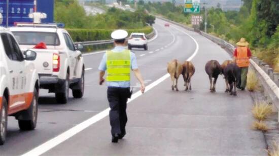 7月31日上午7时,高速公路交警大队接到不少司机报警称,在西部沿海高速往阳江方向斗门服务区路段,有几头黄牛在路上优闲地游荡着,非常危险,也不见有人看管,需要交警到场处理。 接报警后,李警官火速驾车赶到现场。在西部沿海高速东往西28公里处和风山路段,五头黄牛正沿着应急车道缓慢前行,大牛在啃路边的草,还有两头小牛快步窜到车道上“嬉戏”,过往车辆纷纷减速避让。 在和风山路段,往后走1公里就是服务区,可需要逆行,很危险;往前走2公里才能到珠港出口,这是将危险降到最低的方法了。李警官赶紧用警车压道,辅警、路政人员和正在附近养护的人员过来加入护送行列,把五头牛往珠港出口赶去。 走了一小段路后,也许是受到过往车辆的干扰,牛群忽左忽右,一时又走散,真不好控制。万一突然跑出车道,容易发生事故。 细心的李警官发现,这几头牛不管怎么走动,总爱往一头鼻子上牵着绳的老黄牛那儿依靠。李警官突然想到,这也许就是牛群里的“领头羊”,只要控制好带头的牛,便可以稳住其它几头牛。 于是,李警官找来了绳子,牵住了那头老黄牛的头,引着它往应急车道里头走。让人惊奇的是,剩下的四头牛竟也乖乖地紧随其后,排排走。就这样,人带、车压一路向前走两公里左右,花了近一个小时,安全抵达珠港出口,大伙才松了一口气。 这一头,李警官把牛安置好后,正准备给牛牛们发张寻主启事。另一头,高速公路交警大队指挥室又接到报警。“喂,交警,我家几头牛不知道是不是跑上高速了……”原来,来电的正是牛主人黄某,得知牛确实闯上高速后,他的心提到嗓子眼上,再听到牛已经被安全赶下高速时,他才放下心来。 经了解,黄某是附近的村民,这五头牛一直都在服务区附近放养。事发当天一早,黄某照常放牛,可因为临时有事短暂离开了一会。平时这几头牛特别听话,活动范围也不大,黄某也就没把它们拴起来。可他回来后,这几头牛却没了踪影,周围找了一圈都没找到。 黄某很着急,这五头牛可是他的全部家当,万一闯祸了,别说牛出事,生活也没了保障。黄某定神一想,该不会跑上高速了吧?于是赶紧打电话报警,没想到真得到了牛上了高速的消息。 当黄某匆匆赶到珠港出口,看到失而复得的几头牛,非常感谢交警,并向交警保证,以后放牛时一定会小心谨慎,不会再让牛牛们闯祸了。 (文/图 何叶舟 杨小江)