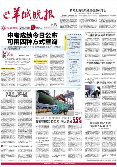 羊城晚报记者 沈婷婷 深圳市教育局8月4日发布消息称,今年深圳市中考阅卷、登分、核查、成绩合成等工作进展顺利,市招考办定于8月5日上午公布全市中考成绩。将采用推送短信、网上查询、微信查询