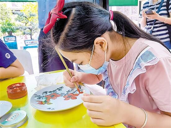 此外,刘老师还手把手教学生制作广彩作品。在勾勒好纹样的瓷胎上,刘老师细心地教同学们进行填色:该如何分清和掌握图案上的厚彩和薄彩之处,如何色彩做到均匀如一。同学们纷纷拿起毛笔,在瓷盘上通过一笔一笔的描绘——火红的木棉花、淡雅的兰花、高洁的荷花等多彩的图案都被描绘了出来。看到自己精心制作的广彩作品,感受着广彩艺术的熏陶,同学们满意地在作品上落款,标上自己的专属印记。参与活动的学生王泽欣感叹:“今天的活动让我发现,花费时间去学习和制作一件优秀的作品是需要耐心的。认识与了解岭南文化,让我们更加懂得传承的初心与使命。”