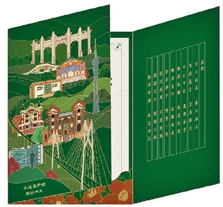中大录取通知书以绿色为主,红色为辅,与中大建筑风格相契合。封面嵌入中大古文字学教授陈炜湛亲笔所书的“录取通知书”。通知书采用三折页的方式,运用篆刻艺术与创意插画,展现粤港澳大湾区及中大三校区五校园的特色标志性建筑。此外,内页以白描、暗纹、彩绘三种形式描绘有“英雄花”之称的木棉花纹,象征勃勃生机与永不消逝的激情。校长寄语承载着对新生的美好祝福,传递以国家民族为己任的中大精神。