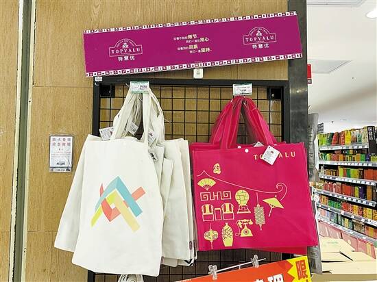 超市摆出供顾客购买可循环使用的购物布袋 |