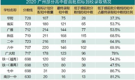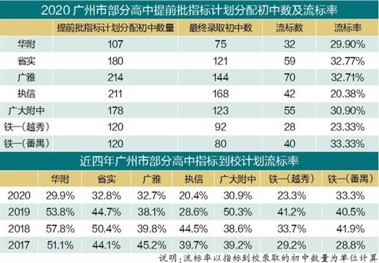 近日,广州中考普高录取结束,作为中考覆盖面最广的“红利”政策,今年的指标到校录取透露哪些信息?羊城晚报记者分析发现,过半学校指标到校录取最低控制分数线降低、流标率下降,带来三大结果,或许是对三年后指标到校不设“限制性”分数线的一次预演,学生、家长、学校都需细细品味。 指标到校计划完成率提升 今年广州市指标到校政策保持稳定,全市66所公办示范性普通高中(70个校区)共提供指标计划19606个,录取14476人,较去年增加1091人,计划完成率约74%,较去年提高近4个百分点。 省、市属示范性高中方面,10所学校(11个校区)提供指标计划3078个,录取2212人,计划完成率约72%,较去年提高约12个百分点。越秀、海珠、天河、南沙4个区分得的省、市属示范性高中指标计划完成率超过80%。 区属示范性高中方面,越秀、海珠、天河、黄埔、花都5个区计划完成率超过80%。其中,增城中学完成率为100%,培正、市5中、天河外国语学校、培英、科学城中学、番禺中学、秀全中学等15所学校的完成率超过90%。 集团核心学校面向集团直接分配指标共280个,较去年增加100个。番禺区石碁第四中学分得仲元中学26个指标,并全部完成;黄埔区玉泉学校分得17个玉岩中学指标,并全部完成,该校分得的52个指标计划全部录满。集团核心学校辐射带动作用进一步发挥,瞄准短板精准发力,定向输送对口帮扶,促进集团内学校共同发展。 过半学校指标到校录取分数线降低 相比2019年指标到校最低控制分数线发现,今年59.4%的学校分数线都有所下降,华附、省实、广雅、执信分别是695分、695分、687分、675分。对比今年这些学校在提前批的户籍生最低录取分数728分、723分、712分、719分,明显看出,今年的指标生能以非常优惠的分数进入名校。 为何今年指标批分数线能如此低?因为,指标到校录取最低控制分数线是由学校近三年提前批最低录取分数的平均值降低20分。而今年考分大幅提高,指标批分数线参照过往三年的情况下,指标批最低控制线相比就非常低了。 流标率呈下降趋势,华附流标率降23.9% 值得注意的是,广州市执信中学的流标率仅为20.4%,广州市铁一中学(越秀校区)流标率仅为23.33%。广东实验中学、广东广雅中学、广州市铁一中学(番禺校区)的流标率均在35%以下,分别是32.77%、32.71%、33.3%。 不少优质高中的流标率都呈下降趋势,例如,华南师范大学附属中学2019年流标率为53.8%,今年只有29.9%,下降了约23.9%;在拥有华附指标计划的107所初中里,有75所中学有学生被华附录取,其中,28所学校的学生是以华附近3年录取最低分数的平均值下降20分进入华附的,比例达37.3%。 今年省实、广雅、执信、二中、六中、广大附、铁一等高中的指标批录取人数,超过一半低于该校提前批户籍生录取最低分数线,在执信录取的168所初中里,有115所中学的学生是以低于719分的分数进入执信的,比例达68.5%;广大附的比例为77.4%;七中则高达86.7%。 部分学校指标批录取分数线逆势上扬 同时,考生需要注意到,也有学校“逆流而上”,指标到校最低录取分数有所提高。例如,海珠区六所纳入指标到校计划的示范性高中,指标到校最低录取分数线近三年来稳中有进。其中广州市第五中学指标到校最低录取分数线2020年为640分,较2018年增加15分;广州市四十一中学、广州市海珠外国语实验中学的指标到校最低录取分数线则与去年持平。 三个结果 低分高录 指标批录取分数线的降低及流标率的下降,带来三个结果: 一是不少学生受益,可以低分高录,各校流标率大幅降低。例如:华附今年提前批指标计划分配初中数为107个,最终录取初中数为75个,而去年华附的指标计划分配给了106所初中,最终录取的初中数为49个。在分配初中数上升数量仅为1所的情况下,今年华附的最终录取学生的初中增加了24个,流标率由去年的53.8%下降至29.9%。 流标率同样大幅下降的还有广大附。与去年相比,今年该校的最终录取的初中数量从去年92所增加到123所,流标指数从93所下降到55所,流标率从去年的50.3%下降为30.9%。 有的家长奇怪,今年指标计划录取的考生中,3559人的录取分数低于招生学校前3年录取最低分的平均分,占比约为25%。对比2019年,指标计划录取的考生中,5011人的录取分数低于招生学校前3年录取最低分平均分,占比约为37%。貌似真正受益的指标生变少了?其实,如果理解了上面的逻辑就会明白,今年形势对指标生非常有利。 或推高统招批分数 第二个结果是可能推高了统招批(提前批和第一批)的分数。今年录取分数普遍上涨,一方面跟题目难易有关,另一方面也跟指标批完成率高有关。 指标批与统招批有类似此消彼长的关系。如果指标批分数线低,指标完成率高,流标回流给统招批的名额就越少。 预演:如果三年后取消控制线 第三个结果是,今年的中考情况可能是对三年后指标到校的一次预演。 今年1月,广东省教育厅下发了《关于进一步规范普通中小学招生入学工作的指导意见》,其中有关于指标到校的规定:名额分配招生采用单独批次、单独录取的招生办法,原则上不得设“限制性”分数线。从2020年入学的初中一年级新生起,普通高中学校名额分配招生一律不得设“限制性”分数线。 设想三年后指标到校不再有最低分数线,学生、家长、学校可从今年情况预见三年后的中考。 对于学生来说,指标生主要在初中校内竞争指标名额,有机会以低分