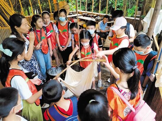 珠三角研学团队在丹霞山古寨坪科普学堂体验磨豆腐乡土课程 图/受访者供图