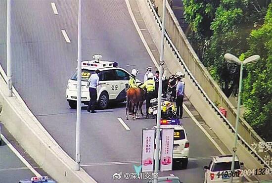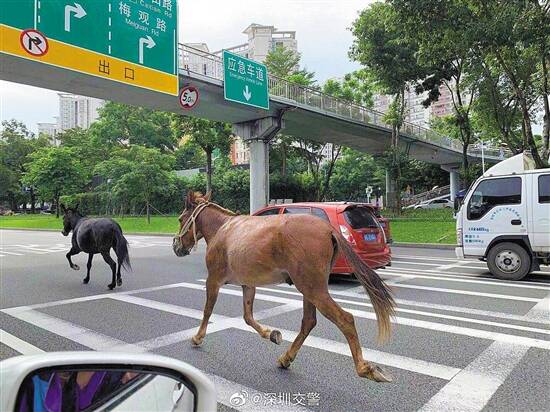 羊城晚报讯 记者宋王群摄影报道:9月7日9时3分,深圳南山塘朗山隧道段转北环大道往福田方向的高架桥上,出现一对“不速之客”,两头骡子(未系绳)在机动车道上奔跑。交警铁骑赶到后一路护送,寻机拦截,最终在罗湖春风高架附近将骡子控制,幸未发生交通意外。至此,两头骡子在深圳闹市区奔跑了近20公里。 7日上午早高峰,南山塘朗山隧道段转北环大道往福田方向交通繁忙,两头骡子的出现,又给道路“添堵”不少,过往车辆纷纷减速让行,好奇的车上人员拍下了两头骡子奔跑的画面,朋友圈一时传播开了。9时23分,交警接警后在罗湖找到了骡子,而此时骡子已经从北环大道来到了泥岗路,交警发现两头骡子未系绳,一时无从下手控制骡子。为保证安全,多名铁骑围绕骡子一路随行,提醒周边车辆保持安全距离,并伺机截停。10时许,交警中午找准时机在春风高架处将骡子截停。10时30分,警方联系骡子主人田某至现场将骡子领回。从塘朗山隧道志春风高架,两头骡子已经在深圳闹市奔跑了约20公里,幸好交通未受较大影响,也未造成交通事故。 记者了解到,两头骡子原本在塘朗山上拉建筑材料的,山路崎岖,有些设施建设只能依赖骡子将水泥沙石拉上山。骡子主人田某称,这两只骡子是三四个月前从广西拉过来的,6日晚查看骡子还在圈养的地方,7日早上八九点发现骡子挣脱缰绳跑出来了。随后他们拨打110,向辖区派出所报警处理。谁想骡子来了一个深圳“马拉松”,从南山一路奔跑至罗湖才被截住。随后交警叫来货车,和田先生一起将骡子运回塘朗山郊野公园的工地。 交警表示,骡子上路,并无人员骑行,所以不能判定为违反交通法,但从治安管理处罚法来看,涉嫌扰乱公共秩序,目前交警已将案件移交给南山警方处理。