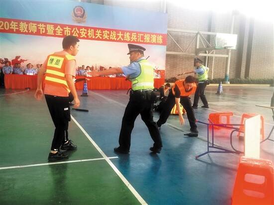“我们是警察,不许动!双手抱头!”几名公安民警突入一正发生打架斗殴的路边摊,并迅速制伏闹事挑衅嫌疑人。这是当天上午进行的多警种实战演练中模拟处置打架斗殴情景。实战情景模拟结束之后,公安民警们还展示了特警制暴术、棍盾术、防暴对抗演习等等演练科目。 演练结束后,佛山市副市长、市公安局党委书记、局长陈小坚代表市公安局党委向全市公安教官致以节日的问候和崇高的敬意。她表示,近年来,佛山全市公安机关坚定不移实施素质强警战略,教育训练硬件建设不断改善、教官队伍不断壮大、教育训练水平不断提升。全市公安机关教育训练工作要坚持政治建警和政治建校方针,狠抓“从严治校”和从严治警,教育和培训全市广大公安民警进一步坚定理想信念,不断提升广大民警履职本领,切实维护好政治安全和社会稳定。 活动现场还对全警实战大练兵第一批部级、省级“训练标兵”进行了表彰。佛山市公安局禅城分局刑事侦查大队获全警实战大练兵部级标兵集体,佛山市公安局禁毒支队民警杨彬、禅城分局民警曹宏伟、顺德区公安局民警梁伟成获全警实战大练兵部级标兵个人。