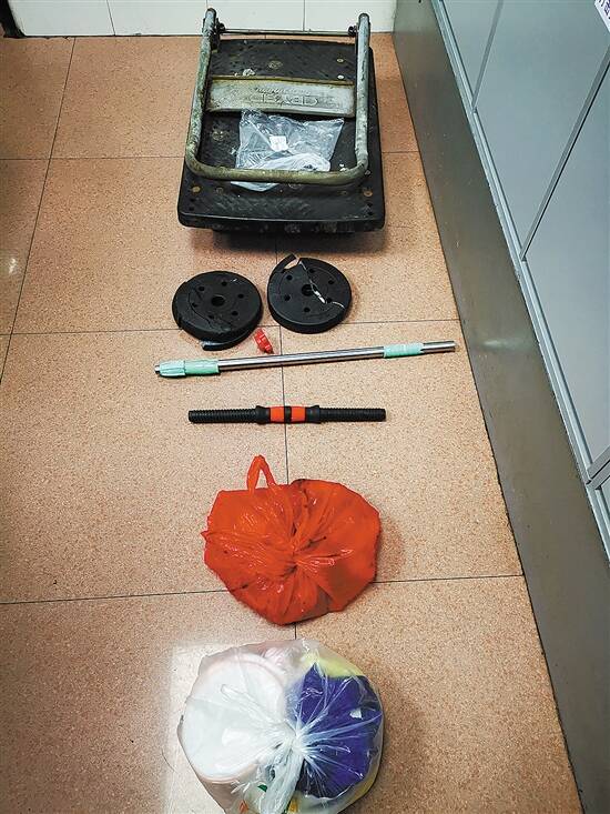从高空掉落的垃圾袋、臂力棒、哑铃铁饼和小推车 |