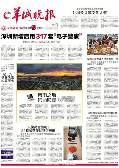 羊城晚报讯 记者王磊摄影报道: 9月15日傍晚,经过一天的暴雨洗礼,深圳天空出现绚丽晚霞。 15日当天,深圳大部分地区普降大暴雨。14时15分,深圳市气象台在福田区、罗湖区、龙岗区(南湾、布吉