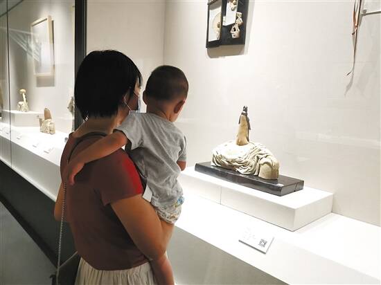 市民带着小朋友在欣赏曾氏兄弟的陶艺作品 |