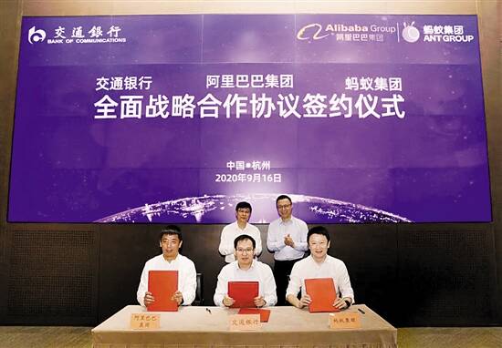 9月16日,交通银行与阿里巴巴集团、蚂蚁集团在杭州签署全面战略合作协议。在交通银行董事长任德奇、蚂蚁集团董事长井贤栋的见证下,交通银行副行长周万阜与蚂蚁集团高级副总裁黄浩、阿里巴巴集团副总裁刘伟光代表各方进行签约。 根据协议,三方将进一步发挥各自优势、集成互补、互通场景,整合平台、客户、市场、渠道和技术等资源,打通银行服务、场景权益与客户消费全链路,致力于成为数字经济时代下互联网公司与金融机构深度合作的典范,优化数字化转型效能,为双方客户提供更好的服务。 各方达成共识,此次全面升级战略合作伙伴关系,既是三方多年来合作关系的延续、巩固和深化,也代表了互联网公司和商业银行对金融科技创新共赢前景的共同期待。 交通银行董事长任德奇表示,交通银行和阿里巴巴、蚂蚁集团有着共同的使命和愿景。此次全面战略合作的达成,也是交通银行拥抱金融科技、数字化转型的重要一步。希望未来和阿里巴巴集团、蚂蚁集团共同打造新服务模式、创新产品形式,丰富生态,服务实体经济效能提升。 蚂蚁集团董事长井贤栋表示,交通银行是中国历史最悠久的银行之一,也是勇立时代潮头的典范。我们相信独行快,众行远。双方合作可以优势互补,搭建一个合作共赢的生态,数字技术带来的包容性发展的红利,让金融服务更好地服务实体,让更多的普通用户和小微企业从中受益。 各方在交流中表示,随着互联网与金融的深度融合,各方将在当前合作基础上,以科技创新合作为契机,在金融服务、支付业务及数字金融场景拓展、金融科技、市场创新合作等多个领域实现全面合作。