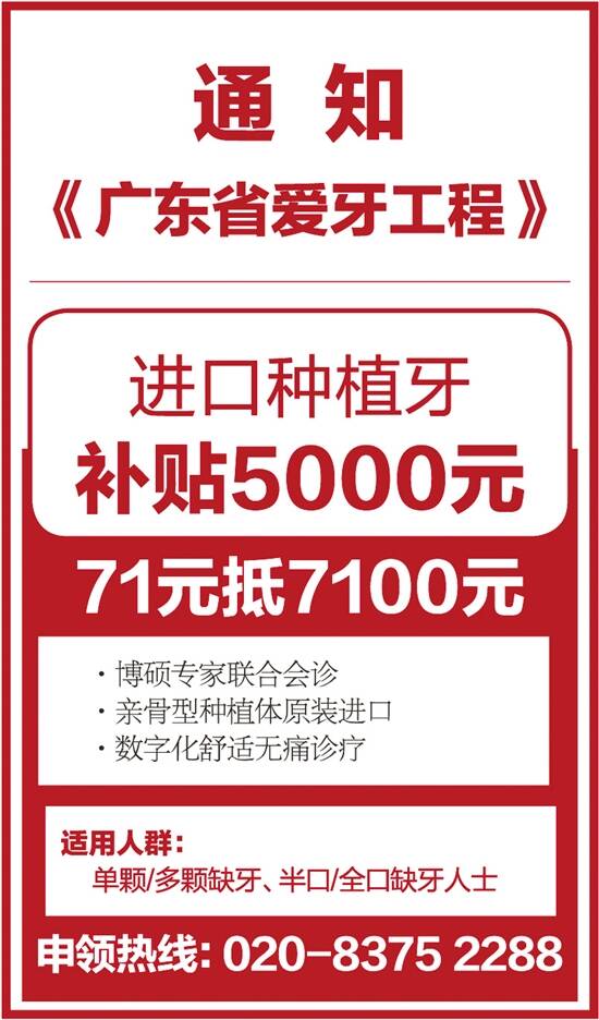 “广东省爱牙工程”派福利,即日起致电020-8375 2288申领5000元/颗种牙补贴,抢0元种植牙方案设计名额,享博硕学位种植名医亲诊,免挂号费、专家会诊费!