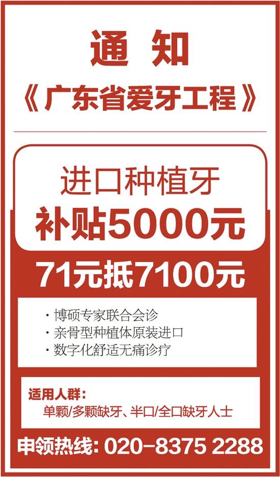 文/华章 缺牙危害大,健康牙齿是长寿保障! 很多人觉得年纪大了缺几颗牙是正常的,可是牙齿“下岗”,就意味着身体健康少了个“ 守门人”,危害身体健康。根据美国口腔健康数据显示:牙缺失会更加影响人们对食物的营养摄入,引起早衰、肠胃功能絮乱、人体营养缺乏等。瑞士口腔专家对全球1万名中老年人跟踪研究的结果触目惊心:缺牙者平均寿命比牙齿健全者短11.7年! 领爱牙补贴,种新牙享口福 黄叔是这次爱牙工程社区行的受益者,最近后槽牙齿开始松动,吃到太硬或者太凉的食物就更加酸疼,根本使不上力。在电视看到“广东爱牙工程社区行,看牙有援助补贴”,就决定过来看看。经过专家诊断黄叔是后槽牙齿松动,需要拔除再进行数字化舒适无痛种植牙,由于领取了种牙补贴,所以在种牙方面的费用也大大较少! 安全,舒适,精准的智能口腔种植牙 数字化舒适种植牙是在院内将数字化贯穿整个种植治疗过程,首先根据数字化口内扫描数据在计算机上重建患者的口腔三维模型,并以此为基础,确定患者种植体嵌入位置、数量、种植深度、角度等,生成科学、精准的数字化种牙方案,然后在3D数字化导板辅助下进行种植,减少手术风险,为市民带去更加精准、安全、舒适的缺牙修复服务。德伦口腔特设舒适麻醉科,舒眠麻醉、STA舒适麻醉、笑气麻醉满足不同年龄的舒适种牙需求,减轻市民种牙恐惧和疼痛。 广东省惠民看牙补贴正式发放 “广东省爱牙工程”是由广东省临床医学学会协办、广东省老年基金会为指导单位、德伦口腔为承办单位及唯一技术指定单位的公益活动,为让更多市民“看好牙,易看牙”,推出系列补贴政策,拨打020-8375 2288申领补贴: ●德伦种牙节:71元抵7100元 ●5000元/颗进口种植体补贴 ●0元种植方案设计【限量100名】 ●0元博硕学位专家挂号费【限量100名】