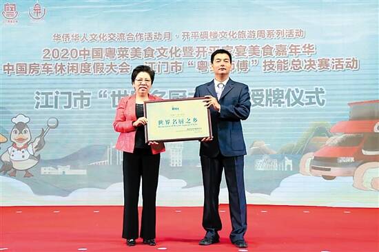 国际饭店与餐馆协会执行董事韩明向江门市副市长郑晓毅授予“世界名厨之乡”牌匾 图/开平市委宣传部 |