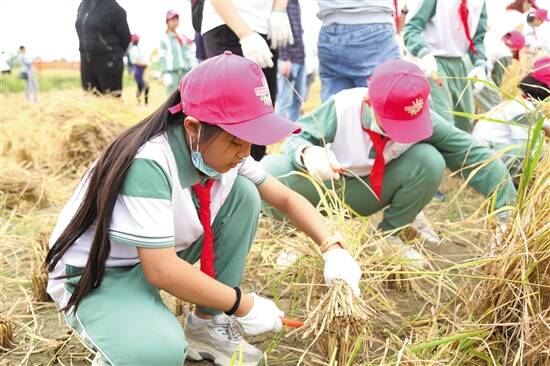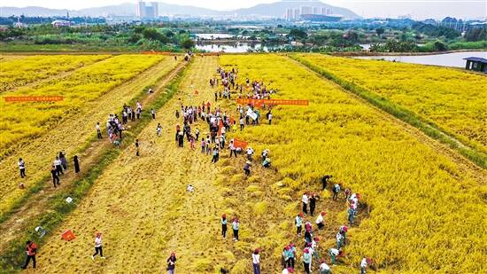 文/图 羊城晚报记者 余宝珠 通讯员 尹巧瑜 金秋时节,正是晚稻成熟时。11月4日,东莞市寮步镇举行“庆丰收,迎小康”水稻田丰收节活动,组织全镇广大干部群众前往水稻种植地,参与水稻田收割活动,体验农耕乐趣,学习农耕文化。据悉,今年,寮步60多亩水稻田迎来了第二次大丰收,下半年收割晚稻5.5万多斤,全年水稻收成达10万多斤。 田间地头一派丰收景象 水稻田里,金灿灿的稻谷连成一片,田间地头一派繁忙的丰收景象。上午10时,300多名干群以及师生、家长走进水稻田,纷纷拿起镰刀收割稻谷,在辛勤劳作中感受丰收喜悦,用汗水助力乡村振兴发展。 “孩子们,农民伯伯来教你们割稻谷,左手握着禾秆一半的位置,右手拿着镰刀,田里留下三分之一的禾秆。”稻谷收割现场,广大干群躬身劳作体验了一把打谷子的艰辛与乐趣,大家兴致勃勃地拿起镰刀割下了一株株金色的稻谷,田野里不时回荡着欢声笑语。 通过此次切身的收割体验,学生们真实感受到粮食的珍贵,激发了他们对农业的兴趣。“农民伯伯真不容易,这次割稻谷的体验活动,让我们真正体会到了,我们每天吃的米饭,原来都是这样辛苦得来的。”香市小学郑同学说,今后一定不会浪费粮食,学会节约粮食,珍惜农民伯伯的劳动成果。此次活动,旨在借水稻田丰收契机,组织全镇广大干部群众以及师生、家长参与水稻田收割活动,向广大学生普及农业科普知识,充分发挥水稻田的社会效益,加快创建美丽田园,深入实施乡村振兴战略。 水田将种油菜花变景点 望着金灿灿的稻田,村民陈沛登脸上充满喜悦之情。陈沛登是这片水稻田的管理人员,负责种植和打理稻田,这片稻田凝聚了村民们一年来的心血。在收割现场,陈沛登等村民走进稻田里,他们卷起袖子熟练地收割稻谷,并将一把把割下来的稻穗放进打谷机里,除掉秸秆后,筛选出一粒粒稻谷。 据介绍,此次收割的晚稻品种为“美香粘”,鲜米颗粒均匀温润,具有独特的自然清香,食用口感可口味美。晚稻收割完后,这片水田将种上油菜花,既能保护水田,又能美化景观,打造生态观光景点,为群众提供游玩好去处。 记者了解到,这片寮步镇水稻田位于金富路与寮城中路交叉地块,地理位置优越,地块总面积约60多亩。改造前是镇政府征用后的搁荒建设用地,地块上违规搭建大量窝棚及堆填生活垃圾,环境脏乱差及安全隐患较为突出。寮步镇政府以“美丽田园”实施乡村振兴战略为契机,在保留现状土地性质与提升环境的前提下,通过整治地块、拆除田间窝棚、清理非法畜禽养殖等一系列理念措施,将其打造成集环境提升、休闲观光、科普教育于一体的东莞首个以学农、劳作、科普为主题的实践基地,传承并弘扬当地丘陵片区优秀农耕文化,助力东莞乡村振兴。