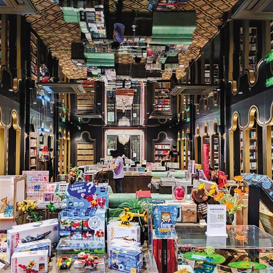 书店内,整体以深色调为主,搭配暖色的灯光,让店内氛围恰到好处,细看店内的装潢,每个侧面被分割成若干隔间,分类摆放各类书籍,隔间的设计则用到了老西关建筑的形象符号,极具辨识性。
