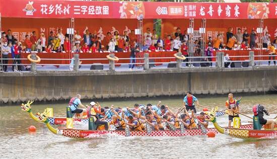 羊城晚报记者 欧阳志强 通讯员 陈健欣 摄影报道 近日,由佛山市顺德区陈村镇人民政府、陈村镇新时代文明实践所举办的“国通杯”2020陈村首届龙舟争霸赛进入总决赛,四大项目各自的八强队伍在文海河上振臂挥桨,进行着最后的冲刺角逐。在彩龙巡游方面,仙涌村、潭洲村、永兴社区获得金奖;龙舟竞赛方面,圣辉仙涌女子龙舟队、赤花女子龙舟队、大都女子龙舟队获女子200米决赛前三名;圣辉仙涌女子龙舟队、赤花女子龙舟队、永兴女子龙舟队获女子500米决赛前三名;陈村镇机关龙舟队、石洲龙舟队、赤花龙舟队获男子200米决赛前三名;陈村镇机关龙舟队、赤花龙舟队、仙涌龙舟队获得男子500米决赛前三名。 据悉,本次龙舟争霸赛,是陈村历史上首次采用12人国际标准龙舟、严格按照中国龙舟竞赛规则举行的龙舟盛事,在陈村镇龙舟赛事标准化、规范化、国际化中具有标志性意义。 ◎彩龙巡游争奇斗艳,展现高质量发展新成果 蓝天白云,文海河畔,3个女孩划着船,唱着《我的祖国》,“一条大河波浪宽,风吹稻花香两岸……”伴随着悠扬的歌声和刺激的水上极限运动表演,2020年陈村首届龙舟争霸赛正式拉开序幕。 陈村镇镇长容佰辉表示,32支队伍、300多名龙舟健儿将在文海河上挥桨劈浪,展现奋勇争先、一往无前的顺德龙舟精神。除了精彩激烈的竞赛外,陈村还精心准备了彩龙巡游环节,22条彩龙很好地展现了陈村村改、文旅、产业的发展成果,及企业、村居的精神风貌和美好愿景,为市民群众呈上一场乡村振兴、全民共享的特色文化盛宴。 11月14日决赛当天,在龙舟速度竞赛之前,彩龙巡游队伍率先登场,22支彩龙队伍,风格各异,精彩纷呈。村级工业园改造、产业、文旅3条主题彩龙缓缓划过碧波荡漾的文海河,映照着陈村镇践行新发展理念和高质量发展的成果。15个村(社区)匠心设计装扮各自主题彩龙,展示乡村文化、乡村特色、治理经验和建设成就,让本届龙舟赛成为了各村(社区)乡村振兴的展示平台;还有陈村镇总商会及国通集团、科达制造、申菱环境4条彩龙,展示出总商会和陈村镇龙头骨干企业的风采。 ◎15个村居“龙争虎斗”,全民参与焕发新机 当天的彩龙巡游结束后,龙舟争霸赛正式开始,随着发令枪“砰”的一声,龙舟像离弦之箭,向着终点冲刺。 据介绍,今年的龙舟赛,得到陈村15个村居的积极响应和参与,均派出2支队伍参赛,还有镇机关队和职校队,最终32支参赛队伍由成年男子组18支队伍和成年女子组14支队伍组成。 来自陈村镇15个村居、企事业单位的32支队伍,经过11月13日的激烈初赛,分别诞生了男子200米、女子200米,男子500米、女子500米的八强。 尽管都是业余运动员,但经过前期紧张训练,龙舟健儿们用整齐划一的动作展示着同舟共济、力争上游的龙舟精神!