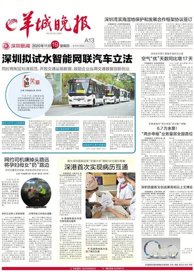文/图 羊城晚报记者 李天军 11月17日,记者采访深圳市交通局有关部门获悉,深圳将率先开展智能网联汽车立法,推动智能网联汽车的落地应用,并出台了相关配套政策,鼓励企业对未来出行模