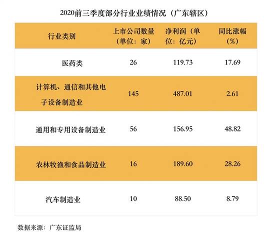 羊城晚报记者 丁玲 前三季度广东上市公司经营业绩持续回升,总体优于全国。近日,羊城晚报记者从广东证监局获悉,今年前三季度,广东664家上市公司克服新冠肺炎疫情等因素影响,整体经营业绩加速复苏,盈利企业数量持续增长,营业总收入增速回正,多项主要业绩指标优于全国。其中第三季度营业收入、净利润延续二季度的增长势头,增速明显加快,为广东应对疫情冲击、地方经济稳步复苏发挥了中流砥柱作用。 实现营业总收入5.14万亿元 从整体来看,前三季度广东上市公司业绩呈持续复苏态势。广东证监局数据显示,前三季度,广东664家上市公司实现营业总收入5.14万亿元,同比增幅由上半年的-0.99%转为3.12%,高于全国上市公司2.72个百分点;归属于母公司股东的净利润5103.74亿元,同比降幅由上半年的13.71%收窄至4.48%,低于全国上市公司2.22个百分点。截至9月30日,广东上市公司总资产达36.43万亿元,净资产为6.88万亿元,较年初分别增长10.53%、10.08%。 其中,实体公司为全省上市公司整体业绩复苏提供了强力支撑。前三季度,广东627家非金融、地产业的实体上市公司共实现营业收入3.21万亿元,同比增幅由上半年的-3.45%转为0.94%,实现净利润2174.09亿元,同比降幅由上半年的13.96%收窄至1.12%。 值得一提的是,三季度业绩增速明显加快。第三季度,广东664家上市公司实现营业总收入1.9万亿元,环比增长6.04%,同比增长10.86%,较第一、第二季度增速分别加快20.92个百分点、2.98个百分点;实现净利润1974.26亿元,环比增长1.27%,同比增长14.34%,较第一、第二季度增速分别加快43.55个百分点、15.08个百分点。 同时,盈利企业数量也有所增多。前三季度,广东有564家上市公司披露盈利,较上半年增加15家,盈利面达84.94%,较上半年扩大2.59个百分点,高于全国(84.4%)。全省过半数上市公司(333家)实现净利润同比正增长或扭亏,其中141家公司净利润同比增长50%以上,86家公司实现翻倍,26家扭亏为盈。 医药行业业绩保持快速增长 具体到行业方面,前三季度疫情防控相关行业业绩保持快速增长。 医药行业整体净利润涨幅较大。前三季度,26家医药类上市公司实现净利润119.73亿元,同比增长17.69%。其中新冠病毒检测试剂制造及服务龙头企业达安基因、华大基因、金域医学净利润增幅分别超18倍、9倍、2.3倍,口罩等防疫物资重点保障企业阳普医疗、稳健医疗净利润增幅分别超8倍、6.78倍。 电子信息、装备制造等支柱行业业绩也表现良好。前三季度,145家计算机、通信和其他电子设备制造业上市公司实现净利润487.01亿元,同比增长2.61%。56家通用和专用设备制造业上市公司实现营业收入984.37亿元、净利润156.95亿元,分别同比增长17.99%和48.82%,其中中船防务实现净利润33.18亿元,同比增长44.32倍。16家农林牧渔和食品制造业上市公司实现营业收入1449.14亿元、净利润189.6亿元,同比分别增长15.86%和28.26%,其中温氏股份实现净利润82.41亿元,同比增长35.43%。 外贸型公司正在加速复苏 值得关注的是,包括汽车、外贸在内的众多此前受疫情影响较大的行业也正加速复苏,实现业绩正向增长。 在疫情冲击下,汽车行业一季度生产经营曾一度休克,此后经营业绩逐季回升。前三季度,广东10家汽车制造业上市公司共实现营业收入1589.38亿元,同比增幅由上半年的-5.25%转为7.74%,实现净利润88.5亿元,同比增幅由上半年的-34.34%转为8.79%,一举扭转了上半年整体业绩下降的局面。其中,第三季度实现营业收入664.68亿元、净利润46.3亿元,同比分别增长33.13%、170.92%,较第二季度增幅分别加快13.81个百分点和128.35个百分点。广汽集团第三季度汽车产量59.29万辆,同比增长19.53%,实现营业收入175.07亿元、净利润26.84亿元,同比分别增长19.26%、89.55%,环比分别增长18.58%、22%。 外贸型上市公司业绩也恢复增长。2019年,广东共有402家上市公司披露海外业务收入超过1000万元。这类上市公司外贸业务受国内外疫情持续影响较大,但在国家和广东省出台的稳外贸等政策支持下,经营基本恢复正常,扭转了业绩持续下降的势头。前三季度,上述上市公司合计实现营业收入2.8万亿元,同比增长2.94%,增幅较上半年扩大4.64个百分点,实现净利润2790.42亿元,同比下降0.11%,降幅较上半年收窄9.29个百分点。其中,第三季度共实现营业收入1.07万亿元、净利润1111.67亿元,同比分别增长12.34%、18.21%。 相关链接 广东证监局重抓上市公司质量 为深入学习贯彻《国务院关于进一步提高上市公司质量的意见》(以下简称《意见》),推动提高广东辖区上市公司质量,广东上市公司董事长学习贯彻《意见》精神专题培训班日前在珠海举办。 广东证监局党委书记、局长杨宗儒表示,广东辖区上市公司积极利用资本市场不断发展壮大,已经成长为实体经济的“基本盘”和企业改革创新的“排头兵”,为广东经济高质量发展作出重要贡献。但受经济下行压力加大、国际经贸环境复杂多变等因素影响,辖区部分上市公司经营绩效持续滑坡,治理运作不够规范,少数公司风险隐患不容忽视。 对此,近年来广东证监局坚持“严监管、促合规、防风险、优服务、助发展”的监管理念,将提高上市公司质量作为监管工作的首要任务抓紧抓好。 下一步,广东证监局将深入贯彻落实国务院《意见》精神,不断提升监管服务水平,推动完善政策环境和生态体系,争取在优化上市资源配置、压降存量风险、控制增量风险、提