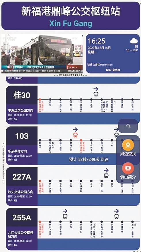 羊城晚报讯 记者欧阳志强、通讯员朱明摄影报道:12月15日,记者从佛山市禅城区交通部门获悉,佛山市禅城区新福港鼎峰公交枢纽站启用,其开发的首个智慧公交电子站牌开始试运行,不仅能提供交互式的公交信息查询体验,还配有自动售卖机。 据禅城区交通部门介绍,该站牌支持全市各路线站点对接,实时展示途经站点各路线票价、首末班次时间等信息,滚动显示每条公交线路最近趟次公交车的距离和预计到达时间。其次,支持多媒体展示功能,电子站牌配置了多媒体播放模块,支持政府公告、公益广告、视频广告等多维度、多形式媒体展示模式。 此外,该站牌还可实现人机交互和手势触控,电子站牌显示屏不仅支持屏幕触控和零接触手势控制,还可手控放大缩小页面,上下/左右滑动展示。另外,为了保障枢纽站的安全运行,还配置了1个1080P摄像头,24小时实时视频监控。视频支持接入公安系统,打击、预防犯罪,搭建平安、和谐的公共候车环境。该站牌可实现远程操控,遇到恶劣天气可及时关闭电源。 在便民服务方面,该站牌配置了语音到站提醒功能,避免乘客错过公交车。同时,嵌入地图功能,可实现路线快速换乘、周边搜索、地区介绍等,并展示当天时间、天气、温度等相关信息。多样化便民服务,让乘客享受到非同一般的等车体验。目前,电子站牌配置单个自动售卖机,支持主流扫码支付方式,为候乘人员提供近距离购物消费,方便快捷,提升出行体验。 记者了解到,新福港鼎峰公交枢纽站目前拥有103、171、184、G17、227A、255A、802、桂30等多条公交线路,它是继金融高新区站公交枢纽中心、南桂路站南海公交快线枢纽中心、祖庙岭南站公交首末站、桂城站公交枢纽站之后,广佛地铁沿线站点中又一个与地铁实现快速接驳的新公交枢纽站场。 交通部门透露,目前,禅城区还计划在新福港鼎峰公交枢纽站附近的黎涌下村站,再次引进智慧公交电子站牌技术,来提升乘客的出行体验。在这两个试点之后,禅城区将根据乘客的体验情况和市场反响,考虑在春节后选择一些人流量较大的公交枢纽站场进行广泛推广。