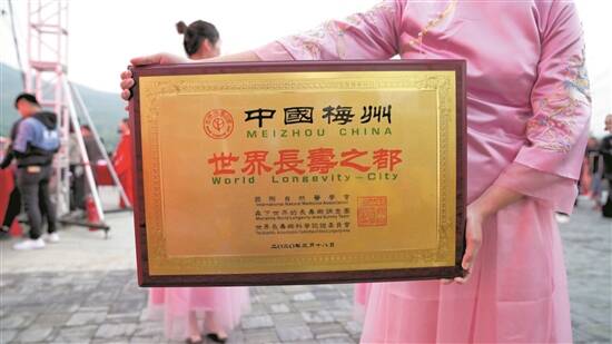 羊城晚报讯 记者危健峰摄影报道:“梅州户籍人口545.49万人,百岁长寿者854人,占户籍人口比例为15.66/10万人。同时,梅州人口平均预期寿命大幅度提高。”12月25日,在梅州举行的“世界长寿之都”授牌仪式上,国际自然医学会副会长、世界长寿乡科学认证委员会副主席王智墨宣读梅州的长寿调查报告,认定梅州为“世界长寿之都”。 至此,梅州市委市政府倾力打造的“世界客都”“长寿梅州”双国际品牌成功打响。 百岁长寿者多达854人 2018年12月,梅州正式向国际自然医学会中国总部提出“世界长寿之都”申报,多次邀请专家团队到梅州进行实地调查。 世界长寿乡科学认证委员会调查报告显示:至2019年10月,梅州户籍人口545.49万人,常住人口437.88万人,百岁长寿者为854人,占常住人口比例为19.5人/10万人。超过15人/10万人的标准。90岁以上长寿老人为20687人,占常住人口比例为4.72‰。80岁以上老人为135677人,占常住人口比例为3.58%。 “国际自然医学会世界长寿乡调查团曾多次受邀到梅州市考察调研,并先后于2014年和2019年认定梅州市蕉岭县和大埔县为“世界长寿乡”。中国梅州市是目前世界上唯一拥有两个“世界长寿乡”的长寿地区,是名副其实的‘世界长寿之都’。”国际自然医学会总部给梅州市委市政府的贺信中写道。 梅州的长寿奥秘在哪里? 绿水青山的生态优势是梅州人长寿的环境基础。梅州位于中国最佳气候带,属亚热带季风气候区,是广东北部生态发展区,也是广东的重要生态屏障和水源涵养地。梅州境内有900多万亩生态公益林,森林覆盖率为73.76%;城区空气质量优良率连续三年达到98%以上、连续多年居全省第一;饮用水源地水质达标率连续多年保持100%。 富硒有机食品和客家饮食文化造就梅州人长寿体质。据最新勘测统计分析,梅州有8280平方公里富硒土壤区域,土壤硒平均含量达0.7mg/kg土,比国家富硒标准高出75%。而梅州柚、嘉应茶、客都米等一大批原生态特产,富含人体必需的“长寿之源”——硒、“生命之源”——锌。梅州客家菜继承和发扬了中原饮食的传统,多取材于自然,荤素搭配,营养均衡,寓医于食,药膳同补。 豁达开朗的心态和较为完善的医疗养老服务是梅州人长寿的内外保障。客家人一路南迁,注重耕读传家、尊老孝悌和崇文重教,在包容开发的客家文化中形成了善良谦让、热情好客、知足常乐的心态。同时,近年来“健康梅州”建设大力推进,建成了3053家医疗机构,还出台实施《梅州市老年人优待办法》《关于建立梅州市80岁以上高龄老人补(津)贴制度的通知》等一系列社会养老保障系统。