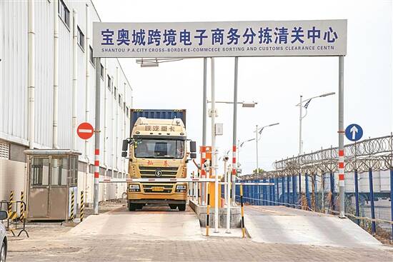 汕头海关查验放行的车辆正在通过宝奥城跨境电子商务分拣清关中心卡口 袁国宏 摄 |