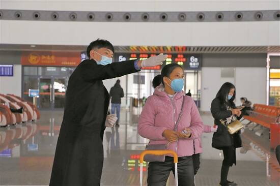 佩戴口罩的江门站工作人员给乘客指路 陈少文 摄 |