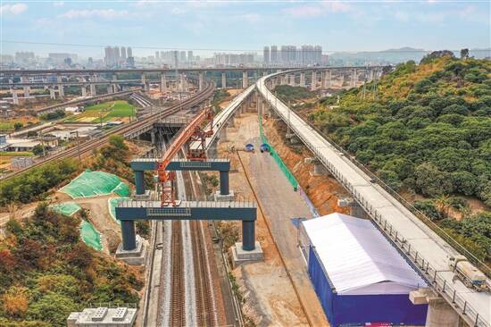 羊城晚报讯 记者秦小辉,通讯员秋平、继伟摄影报道:1月21日凌晨4时,经过连续2天近8个小时的天窗作业,中铁十九局赣深铁路GSSG-8标项目部顺利完成跨越既有广深铁路营业线进行最高级别的Ⅰ级施工——西南联络线连续跨越架设3孔小角度T梁。这标志着赣深铁路塘厦段营业线重要节点施工顺利完成,为春节前标段贯通创造了条件。更深远的意义则是,赣深铁路与既有广深线连为一体后,两条铁路上的列车可在塘厦换线,未来在塘厦站乘车直达广州站、广州东站或不再是梦想。据了解,赣深铁路计划于2021年年底建成通车。 1月20日0时,夜色笼罩下的塘厦与樟木头交界处灯火通明,上百人严阵以待,大型设备准备就绪。施工负责人吕忠华发布开始施工命令,筹备数月的I级施工正式开始,各个工作面展开了紧张有序的施工,现场人员忙碌,机器轰鸣。 “此次Ⅰ级施工是赣深正线与广深铁路互通的咽喉地段,是整个互通体系的关键,广深铁路运输繁忙,只能利用凌晨‘天窗期’施工,而线路条件也极其困难,交角仅为12.7°,且上下均有数万伏高压线,加上左右数条铁路并行,导致大型设备使用空间受限,让本来难度就大的施工更是难上加难。”中铁十九局赣深铁路GSSG-8标项目部副总指挥长李刚表示,在经历了数次高级别的方案论证和修改后,项目部最终确定以预制架设代替现浇横移、以Ⅰ级施工代替Ⅱ级施工的总方针,减少施工各环节对既有铁路行车的干扰,保证营业线设备安全。 据了解,本次跨越既有广深铁路进行营业线Ⅰ级施工工程分两天分段完成。最终,经过近4个小时的紧张施工,1月20日凌晨4时整,在中国铁路广州局集团、中铁十九局集团及其他相关单位领导的现场见证下,历时240分钟的首个跨营业线Ⅰ级施工顺利完成,全部11个工况施工正点销记;而后,1月21日凌晨,第二个跨营业线Ⅰ级施工顺利完成,4榀T梁稳稳地架设在桥墩上,标志着跨越既有广深铁路进行营业线Ⅰ级施工全部完成。截至目前,赣深8标营业线施工已完成Ⅰ级施工2次、II级施工14次、Ⅲ级施工500余次,争取春节前完成剩余工程,该标段将完全贯通。 赣深铁路与广深Ⅰ、Ⅱ线间的塘厦东北联络线长2.255公里,塘厦北东联络线长2.011公里;广深Ⅰ、Ⅱ线与赣深铁路间的塘厦西南联络线长2.116公里,赣深铁路与广深Ⅲ、IV线间的塘厦南西联络线长 2.061公里。总长8.443公里的4条联络线把赣深铁路和广深铁路连接起来,经停赣深铁路塘厦站的列车,可以通过联络线转入广深铁路,到达位于天河、越秀的广州东站、广州站。届时,从塘厦乘坐高速动车组到深圳不到半小时,到赣州不到2小时,到南昌4小时。