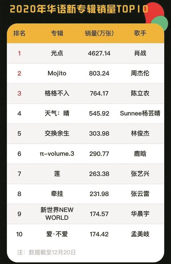 羊城晚报记者 胡广欣 近日,多个平台的年度音乐报告陆续发布,不妨由此看看2020年听众的听歌口味。在代表专业乐迷口味的《豆瓣2020年度音乐榜单》与代表大众听歌习惯的《2020腾讯娱乐白皮书:音乐篇》中,上榜的歌曲几乎完全不同,要诞生一首热度与口碑兼具的全民金曲越来越难。在听众口味越发多元、圈层化越发明显的当下,周杰伦仍然是华语乐坛中唯一能“破圈”的人。 歌曲热度与好评不成正比 《2020腾讯娱乐白皮书:音乐篇》盘点了2020新曲热度前十位,呈现出歌坛巨星、流量歌手、网络歌手三足鼎立的情况。周杰伦在2020年发布的唯一新歌《Mojito》登顶。紧随其后的是三位流量偶像的作品:肖战《光点》、蔡徐坤《情人》、王俊凯《Beautiful》。王源《四百击》、张云雷《探清水河》分别位居第六和第八。榜单里还出现数个陌生的名字,这些歌曲大多通过短视频平台走入大众视野:海来阿木《点歌的人》位居第五,胡66《后来遇见他》位居第七,程响《世界这么大还是遇见你》和阿悠悠《旧梦一场》分别位居第九和第十。 不过,歌曲的热度与好评并不成正比,专业乐迷与大众听众的口味产生割裂。《豆瓣年度2020音乐榜单》评选出十首“年度评分最高EP/单曲”,以上十首歌曲无一上榜。周杰伦的《Mojito》豆瓣评分仅为6.9分,自然挤不进前十,反而五月天与孙燕姿合唱的新版《温柔》、陈奕迅新歌《是但求其爱》位居第三、第四。聚集在豆瓣的专业乐迷并不排斥流量偶像:易烊千玺《My Boo》以8.6分、超过5万人评价而登顶,王源《Stop The Clocks》以8.4分位居第五,鹿晗《π-volume.4》位居第九。独立音乐人颇受豆瓣受众的青睐,卢广仲《刻在我心底的名字》、旅行团乐队《红色的河》、落日飞车《我是一只鱼》分别位居榜单的第六、第七和第八。 豆瓣还评出了十张“年度评分最高专辑”,万能青年旅店《冀西南林路行》、谭维维《3811》、寸铁乐队《近人可读》、易烊千玺《后座剧场》四张内地专辑上榜。但这四张专辑里,没有一首歌曲能登上《2020腾讯娱乐白皮书:音乐篇》新歌热度榜。 流量歌手“霸占”数字销量榜 2020年,音乐付费得到进一步普及。《2020腾讯娱乐白皮书:音乐篇》显示,2020年第三季度,腾讯音乐的在线音乐服务付费用户量达到创纪录的5170万,付费率达8%,远高于2019年同期的5.4%,Z世代(1995年至2005年出生的人)付费意愿走高。目前,国内全平台有18张数字专辑(含单曲、EP)的总销售额突破千万元,数量比2019年有所增加。 音乐付费是否能催生更多优质作品?起码从目前看来,国内的数字专辑销售更多是流量粉丝之间的游戏,并不与作品质量甚至传唱度直接挂钩。《2020腾讯娱乐白皮书:音乐篇》显示,“2020年华语新专辑销量榜”前十位里有八位是流量巨大的年轻艺人,周杰伦和林俊杰成为榜单上仅存的两位传统实力派。肖战《光点》以4627万张(总销售额1.3亿元)位居“2020年华语新专辑销量榜”榜首,连周杰伦都望尘莫及:周杰伦《Mojito》位居销量榜第二位,总销量为803万张。不过,卖得多并不等于听的人就多:《光点》同样位居“2020数字专辑囤货比例榜”第一,购买多张专辑的用户比例达到25.1%。对肖战粉丝而言,“购买”已经成为他们回应外界种种负面消息的重要表态手段。肖战粉丝并不是特例,事实上,购买多张专辑为偶像打榜早已成为粉丝圈子的潜规则。“2020数字专辑囤货比例榜”榜单上清一色是拥有巨大流量的艺人,包括鹿晗、张云雷、张艺兴、阿云嘎、吴亦凡、陈立农等。 要收益还是要出圈,成为流量歌手面临的两难困境:付费音乐为流量歌手带来巨大收益的同时,也为听众设立了收听门槛,对受众面仍不广的歌手而言,这种做法让他们的作品难以得到广泛传播。他们的音乐始终只能在粉丝圈子里打转。 “破圈”不再是歌手最高追求 2020,有突破圈层的全民金曲吗?伍佰老歌《Last Dance》通过电视剧《想见你》翻红,《无价之姐》通过热门综艺《乘风破浪的姐姐》刷屏,《青春有你2》的“淡黄的长裙,蓬松的长发”梗让陶喆老歌《Melody》再次受到关注……不过,从《2020腾讯娱乐白皮书:音乐篇》的榜单数据看来,这些热闹一时的歌曲只是昙花一现,全年热度并不高。 2020年,真正能“破圈”的仍然只有周杰伦。作为传统唱片行业制造出来的实力巨星,周杰伦在流量时代有了新的形象。虽然他在2020年只发了一首单曲《Mojito》、新专辑仍遥遥无期,但凭借早已积累的听众基础,以及如今获得的“青春回忆”“奶茶狂魔”“专辑鸽王”等极具娱乐性的标签,周杰伦的受众群体不断扩大。《Mojito》的用户画像显示,周杰伦不仅是“80后”和“90后”的偶像,也得到了“00后”甚至“05后”的青睐:13岁至22岁的听众比例为41.29%,与23岁至30岁的听众比例41.59%几乎持平。而在豆瓣上,周杰伦也高居“年度最受关注艺人”首位。 《腾讯娱乐白皮书:音乐篇》的标题是“破圈无力,自嗨就好”。短视频和直播平台兴起,其用户与传统的音乐听众相去甚远;音乐平台强化定制性,为用户构筑起一个歌曲口味舒适圈;各平台都在版权和艺人上发力,力推独家艺人和歌曲……种种原因,都为音乐的跨平台传播制造了更大的难度。 但也有业内人士认为,圈层化并非坏事,反而反映出华语乐坛的多样性,“破圈”不再是音乐人的最高追求。不同品味的听众能够找到适合自己的歌曲,优