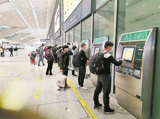 佛山西站,返乡人员正在自助取票机取票 |