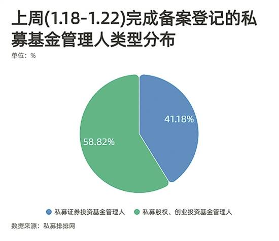 新年以来,基金发行火爆,投资者“借基入市”热情高涨。不仅公募基金屡屡刷新发行纪录,屡屡出现“日光基”“百亿基”,私募基金管理人和产品新增备案的步伐也在加快。据私募排排网不完全统计,仅刚刚过去的1月18日至1月22日单周,新增备案私募管理人共计17家,其中,私募股权、创业投资基金管理人10家,占比58.82%;新增私募证券投资基金管理人7家,占比41.18%。