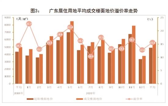 在土地成交方面,据广东房协土地与产业研究中心监测,2020年全省成交经营性建设用地3383宗,成交面积12212.29公顷,同比增长32.5%和25.0%;成交金额8187.23亿元,同比增长46.3%;平均楼面地价2629元/㎡,同比上涨13.6%;整体溢价率为12.6%,同比提高1.2个百分点。