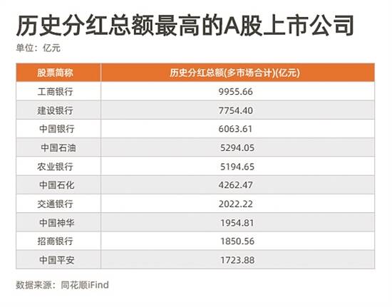 羊城晚报记者 莫谨榕 又到了一年一度的上市公司年报披露季,上市公司分红的情况也受到市场的广泛关注。从实践来看,近年来A股公司投资者保护意识逐步增强,现金分红和投资者回报水平逐年提升。 同花顺iFind数据库统计显示,在2019年度,A股共有2705家上市公司实施分红计划,分红总额高达11392.79亿元,对比2018年度的10352.94亿元,同比增长10.04%,刷新年度分红纪录,也是连续三年分红总额超万亿元。整体来看,30年来,A股累计分红超过10万亿元。 分红指标近年来越来越受到价值投资者的关注,上市公司的现金分红能力成为投资者考察上市公司财务状况的重要参考因素。那么,哪些上市公司分红最大手笔,是值得投资者关注的分红大户? 四大行和两桶油成分红大户 上市公司进行现金分红,实际上是对公司利润进行分配,首先公司必须具有可供实际分配的利润。上市公司分红是保护投资者合法权益、强化股东投资回报的体现,也有利于提升上市公司的规范化治理水平。 羊城晚报记者据同花顺iFind数据库统计发现,在A股历史上,共有3876只上市公司进行过现金分红,历史上累计分红金额超过千亿元的上市公司共有14家。 仅从A股市场的分红金额看,历史上分红金额最高的是工商银行,在A股市场累计分红7533.46亿元,分红金额遥遥领先;排在第二位的是中国石油,历史累计分红4728.37亿元;排在第三、第四位的是农业银行和中国银行,历史分红总额分别是4711.88亿元和4328.11亿元。排在第五位的中国石化历史累计分红为3376.25亿元,而中国神华、招商银行、上汽集团、交通银行、兴业银行、长江电力、中国人寿和中国平安历史累计分红都超过千亿元。 如果将分红金额范围扩大到A股以外的市场,工商银行在多市场合计历史分红金额高达9955.66亿元,逼近万亿元大关;紧随其后的是建设银行,合计历史分红总额高达7754.40亿元;排在第三位的是中国银行,分红总额为6063.61亿元。中国石油和农业银行的合计分红总额都超过5000亿元。 从分红大户所属的行业性质来看, 银行、能源类企业成为大手笔分红的主力干将,长江电力成为分红千亿的唯一一家电力企业,而上汽集团也成为分红大户中唯一一家汽车企业,上述14家企业绝大多数是央企,前10名基本被四大行和石油企业占据。 如果把标准放宽到历史分红总额超过500亿元的个股,则民生银行、贵州茅台、浦发银行、中信银行、宝钢股份、大秦铁路、万科A、光大银行、格力电器、中国太保、华能国际、中国建筑、中信证券均榜上有名。 从分红的次数上看,历史上分红次数最多的是中国石化,分红次数高达38次;紧随其后的是万科A,分红次数达到29次;粤电力A、佛山照明、豫园股份的分红次数均是28次;申能股份、上海石化、云南白药等6家上市公司的分红次数都达到27次。历史上分红次数超过20次的上市公司共有211家。 高分红组合能获得超额收益 除了累计分红总额外,股息率也是观察上市公司分红的重要指标。股息率是股息与股票价格之间的比率,最能体现投资者的分红收益率,是衡量企业是否具有投资价值的重要标尺之一。 同花顺iFind数据显示,以近12个月税前派息总和与最新股票市值的比例计算,共有111只个股的股息率超过5%。股息率最高的是大东方,在2020年中期分红派息方案中,每10股派发现金红利5元(含税),合计派发现金红利总额为4.42亿元,股息率达16.87%。此外,华夏幸福的股息率达到15.07%,文科园林的股息率达到14.90%。天威视讯、永利股份、益佰制药、建新股份、广汇物流、长久物流的股息率都超过10%。 长期来看,高分红组合能获得明显的超额收益。以沪深A股中现金股息率高、分红比较稳定、具有一定规模及流动性的100只股票为成分股,以反映A股市场高红利股票的整体表现的中证红利指数在2010年以来累计上涨约35.57%,而上证指数在同期的累计涨跌幅仅为11.15%。如果考虑红利再投资的复利效应,高分红组合的超额收益率将更高。 截至2月22日收盘,在2020年年报披露期间,共有19家上市公司披露了2020年度的分红预案,不少上市公司都给出了较为慷慨的分配预案。比如,主营生物医用材料的爱美客披露,基于公司持续、稳健的盈利能力和良好的财务状况以及对未来发展的良好预期,为积极合理回报投资者、共享企业价值,拟向全体股东每10股派发现金红利35元(含税),合计派发现金股利42070万元。同时进行资本公积金转增股本,向全体股东每10股转增8股。而中国平安在去年实现总收入13214.18亿元,同比增长3.8%;实现净利润1430.99亿元,同比下降4.2%,拟向股东派发全年股息每股2.20元,同比增长7.3%。 有的上市公司分红比例较低。比如,沃尔核材和蔚蓝锂芯军给出了每10股派发现金红利0.3元(含税)的分红预案。随着2020年年报披露进入高峰期,相信越来越多上市公司会给出可观的分红方案。