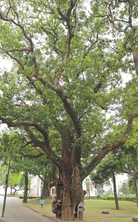 在珠海市金湾区南水镇南场村,一个古树公园里有一棵树龄达513年的秋枫树,被划入国家一级保护古树。古树历经风霜雨雪,记录了世事变迁,收录了一代又一代人的喜怒哀乐。 据了解,这个位于南场村的街角公园秋枫苑以古树秋枫而著称。虽然占地面积不大,但公园里的植物都被精心呵护,循着步道往前走去,就是公园的“主角”——约30棵年过“百岁”的秋枫树,最老的一棵秋枫树达513年树龄。 说到秋枫树,大家更为熟悉的可能是“停车坐爱枫林晚,霜叶红于二月花”里面的“枫”,而南场村这片秋枫林,它的叶子秋天并不会变红,而是四季常青。到了夏天,郁郁葱葱的树木枝丫相连、碧叶遮天,馈赠人们无限阴凉。 “最惬意的事,莫过于一家子在这秋枫树下乘凉。”有村民这样说。南场村依树而建,秋枫树自然也是村子的象征,它承载了许多村民的回忆。由数百年的生长积淀所造就的粗大树干与树瘤突显了树木的古老与沧桑,它们仿佛是经由自然之手雕琢而成的精美艺术品,村民们手拉手环抱树干,需要5人才能抱拢。 (文/图 梅尔)