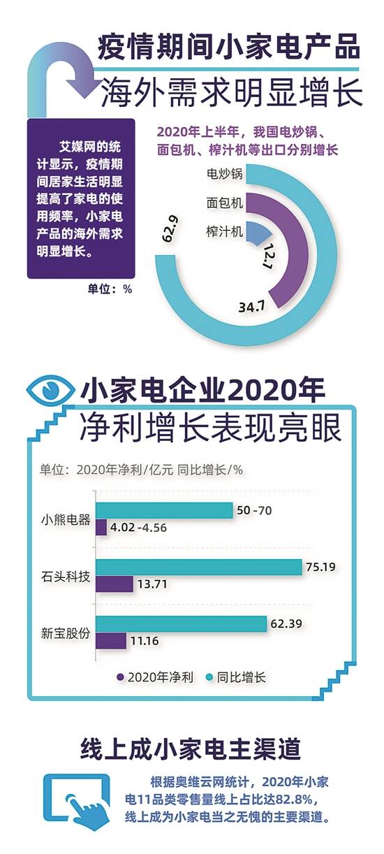 文/羊城晚报记者 王丹阳 制图/黄国栋 “宅经济”下小家电进击,销售火爆。3月上旬,海关总署公布的数据显示,前两个月,中国出口机电产品1.85万亿元,同比增长了54.1%,占到出口总值的60.3%。其中,咖啡机、电热理发器等小家电产品广受青睐,家电出口从去年6月起一直保持两位数增长态势。羊城晚报记者注意到,“宅经济”下,中国家电行业2020年稳步恢复,出口突破800亿美元大关。其中,小家电表现亮眼。工商登记显示,我国2020年共新增19万家小家电相关企业。但另一方面,在机遇之下,小家电也面临着成本上升、线上需求“透支”与如何获取年轻消费者“芳心”的挑战。 空气炸锅、煎烤机、电拖把都受捧 小家电赚足眼球 在广东顺德,格兰仕集团副董事长梁惠强介绍,今年一季度,格兰仕外贸订单平稳增长,一季度预计同比去年增长90%,同比前年增长60%。 羊城晚报记者注意到,“宅经济”下,能满足疫情期间人们居家生活和工作需要的家电产品从去年至今热度不减,全产业链的优势给中国家电制造业带来更多的海外订单。中国家用电器协会的官网信息显示,中国家电行业2020年稳步恢复,出口突破800亿美元大关,走出了漂亮的V型反转。其中,小家电中出口订单占比较高的吸尘器、电热烘烤、微波炉等产品产量也都有大幅增长。 疫情下的“宅经济”让小家电需求不断,在2020年赚足了眼球。 中国家用电器协会的数据显示,2020年上半年,烹饪类小厨电如空气炸锅、煎烤机等,清洁类小家电如吸尘器、电拖把等,个护类小家电如理发器、个人按摩设备等,受“宅经济”带动销量大涨,下半年虽有所回落,全年增速仍保持两位数。其中,“宅经济”下人们居家时间变长,带动洗碗机逆势增长,全年销售额增幅超过25%。 艾媒网的统计显示,疫情期间居家生活明显提高了家电的使用频率,小家电产品的海外需求明显增长。仅在2020年上半年,我国电炒锅、面包机、榨汁机等出口分别增长62.9%、34.7%、12.1%。 家电协会2020年前三季度的统计显示,小家电多数品类累计出口额增速从2020年7月开始转正,8月、9月均持续增长,且规模持续创新历史最好水平。其中电动器具增速在所有品类中持续领先,截至9月累计出口额增幅高达61.8%,当月增幅达100%。 搭上直播带货便车 线上渠道快速发展 疫情的到来也使得小家电的线上渠道在去年快速发展,搭上了飞速成长的直播带货的便车。根据奥维云网统计,2020年小家电11品类零售量线上占比达82.8%,线上成为小家电当之无愧的主要渠道。 中原证券研报认为,小家电线上终端市场销售显著优于线下,且分化明显。线上市场中,主要小家电产品今年1月销售额与销售量同比增速全面大幅度攀升,线下市场小家电销售情况惨淡。吸尘器是唯一在线上与线下市场中同比销额销量正增速的小家电产品。 从A股市场小家电企业发布的业绩快报和预报来看,小家电企业2020年净利增长表现亮眼。 新宝股份3月发布的业绩快报显示,2020 年营收131.80亿元,同比增长44.44%,归母净利11.16亿元,同比增长62.39%;主营扫地机器人的石头科技2月发布的业绩快报显示,2020年营收45.3亿元,同比增长7.74%;净利润13.71亿元,同比增长75.19%;小熊电器1月披露2020年业绩预告,预计2020年的归母净利润为4.02亿元-4.56亿元,较上年同比增长50%-70%。 打工人独居者偏爱“小” 助力小家电“C位出道” 小家电为何成网红?分析认为,在疫情防控常态化的大环境下,体积小、免安装,单价相对较低、线上销售的特点,让小家电自带“网红”体质。而90及95后年轻消费群体崛起以及逐年增多的年轻独居者,也成为助力小家电“C位出道”的力量。 “高颜值、小容积的小家电,仍是以单身独居人群不断增加发展背景下的主流趋势。”在谈到2021年小家电行业趋势时,奥维云网小家电事业部负责人李婷分析认为,多数生活在一二线城市的打工人,不论是租房还是自行买房,大多数消费者住房面积都较小,而小家电产品占地面积小且更智能,成为了打工人的不二之选。同时,随着国内城市单身人群不断扩大,也使得独自居住的年轻人们更偏向购买小家电产品,避免鸡肋。 例如,去年一些偏互联网特性的年轻化小家电品牌,就推出“一人食”等高颜值、潮卖点的产品,用社交化营销手段抓住年轻时尚一族。 这些新兴小家电品牌对头部品牌造成一定程度的影响。作为小家电行业龙头的美的集团,董事长兼总裁方洪波也曾在今年美的年会上表示,要反思美的为何没及时抓住新兴小家电的细分市场机会。同时,为了在创意小家电的新赛道上变得更灵活,美的已组建团队,开拓宠物电器、母婴电器等细分市场,以融入更多互联网思维和用户思维,加快小家电产品创新和迭代的步伐。 同在顺德的格兰仕今年春节后则在B站、小红书、知乎等95后年轻人喜爱的平台发起“出道吧! 小电明星团”,力推一体早餐机、网红电热锅、辅食机、暖奶器等新兴创意小家电产品。 原材料涨价 进击小家电遭遇成本上升 但是,小家电火爆的可持续性,正在面临挑战。 “由于原材料价格上涨导致产品成本上升,我们要被迫涨价了。” 奥维云网小家电事业部负责人李婷介绍,这是小家电企业今年最常说到的话。究其原因,是从去年下半年开始到今年上半年,因为供需失衡,各类原材料都出现不同程度的涨价,比如聚烯烃、玻纤、铜箔等,对于家电企业来说是冲击,尤其是很多处于行业