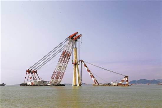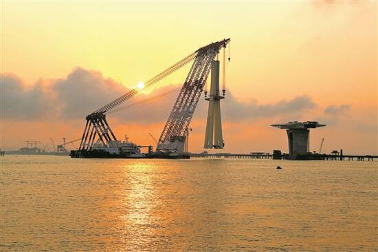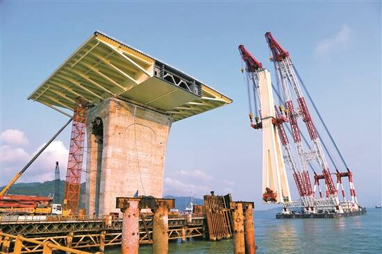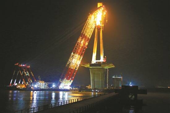 羊城晚报讯 记者郑达,通讯员孟庆虎、孙国圣摄影报道:3月17日23时28分,随着3600吨大桥海鸥浮吊缓慢松钩,一座高106.8米(桥面以上)、重2800吨(含吊具)的钢塔精确落在27号墩0号块钢箱梁T0顶口。至此,由广珠城际投资建设、中铁大桥局承建的世界首座公铁同层多塔斜拉桥——珠海珠机城际金海特大桥27号墩钢主塔成功架设到位。“本次27号墩钢塔吊装时间比第一次26号墩钢塔吊装时间缩短一天,而且重量比第一次还要重100多吨,实现了一天完成一个钢主塔吊装的新突破。”项目部副总工程师支荣介绍说。 大桥27号墩钢主塔横桥向宽17.6米、纵桥向宽14米、高106.8米(桥面以上)、重2800吨(含吊具),在制造厂内采用卧拼方式进行加工制造,钢塔制造完成后整体由船舶运输至桥位,然后进行钢塔架设工作。钢塔采用3600吨浮吊与1200吨浮吊配合整体起吊,空中竖转90°,完成钢塔空中整体竖转。“有别于普通桥塔分节施工,金海大桥的钢塔采用空中整体竖转安装,整个竖转过程分73个步骤,才能将水平放置的钢塔起吊空中翻转至铅垂状态,姿态犹如空中‘跳芭蕾’。”据中铁大桥局五公司珠机城际金海大桥项目经理陈晓剑介绍,大桥桥塔采用四柱式钢塔,桥塔位于桥面中间,塔高106.8米,整个钢塔吊装重量达2800吨,相当将约2000辆小汽车同时吊起,然后旋转。再利用由中铁大桥局自主设计打造的国内起重量最大、起升高度最高的双臂架起重船“大桥海鸥号”3600吨起重船,将其整体提升110米高与钢箱梁顶面精确对位,精确对位偏差以毫米级控制,是全桥施工难度最大的部位。 珠机城际金海特大桥起自珠海横琴新区,跨越西江磨刀门水道,终至珠海机场东路,是珠机城际二期关键控制性工程。大桥是世界首座公铁同层多塔斜拉桥,也是目前世界上最宽公铁两用斜拉桥。
