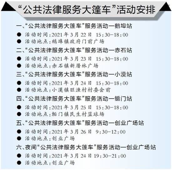 为推动公共法律服务均衡发展,充分发挥公共法律服务惠民生、促发展的职能作用,深圳市司法局、深圳市深汕特别合作区于3月22日至3月26日联合开展深圳市深汕特别合作区“公共法律服务大篷车”服务活动,将优质法律服务送到群众身边。 据悉,本次“公共法律服务大篷车”提供法律咨询、法律援助、公正服务、人民调解共四项服务事项,将在活动现场设置法律咨询点,向群众发放法治宣传资料,由专业法律工作人员为群众提供服务。(蔡鹏飞)