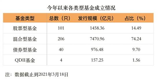 值得注意的是,尽管3月新基金发行遇冷,今年前三个月新基金成立规模仍创下历史新高。数据显示,截至3月18日,2021年以来共成立351只新基金,合计募资规模10063亿元,去年同期新成立基金规模为5159亿元,同比增幅高达95%,这也是公募基金行业历史上第二次基金季度发行超过万亿元。