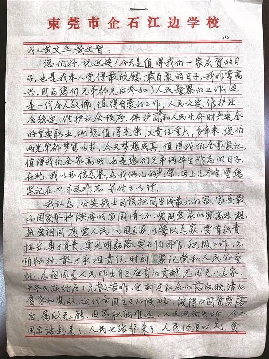 文/羊城晚报记者 文聪 “在每一个关键节点,我都会亲手写一封家书给孩子,希望他们能从中找到一点方向,更好地为人民服务。”这是71岁黄自敬的心声。黄自敬是东莞市企石镇一名退休小学老师,她不仅桃李满天下,还用“三封家书”培育出了两个乐于奉献、恪尽职守的人民好警察。近日,黄自敬被评为“全国公安机关爱警母亲”。 “国是最大家,家是最小国” “以国为家,以警队为家,要有职责担当、勇于承担责任,时刻谨记党和人民的重托,为祖国和人民作出自己应有的贡献。”25年前,黄自敬在给两个警察儿子的信中写下了这样的一段话。 1992年10月1日和1995年6月10日,这是黄自敬记忆最深,也是最欣慰、最自豪的两个日子,因为儿子黄文华和黄文智在这两天分别参警。黄自敬给儿子们写下了两封一样的家书《国是最大家·家是最小国》。 黄自敬在信中写到,“公安战士应该把国当成最大的家,家是最小的国,(要)有一种深厚的家国情怀,爱国爱家的崇高思想,热爱祖国、热爱人民,以国为家、以警队为家,要有职责担当、勇于负责,要光明磊落、不怕困难,要积极工作不怕牺牲。” 这是一封诫勉书,字里行间透露的都是家国情怀。黄文华和黄文智回忆说,刚参警时心情很激动,同时也很迷茫,好像实现了愿望之后不知道如何走下去。而母亲的信让他们沉淀下来,坚定地朝着“为人民服务”的目标前进。 黄文华说,母亲出身书香门第,虽然身为女子,但她总有“休言女子非英雄,夜夜龙泉壁上鸣”的气概。自小从军未能如愿,成为小学教师后,对学生很是上心。“小时候,母亲总喜欢给我们买海军装和迷彩服穿。”黄文智笑着说,现在有人来探访,母亲都会拿出他们穿着警服的合照给大家看看。 “钢铁怕火炼 困难怕志坚” 当被问到第二封家书时,黄文智说:“这封家书是写给我的。我记得那个晚上,我在路面设卡查车,一辆小车车速过快,我来不及闪躲,就被挂倒在地上,左腿小腿被车刮去了一块皮肉。被送到医院后,我也没敢告诉母亲,怕她会担心,只是偷偷地跟大哥说了。没想到第二天,母亲就赶来医院了。” 黄自敬看着躺在病床上的儿子,心里很担心,也很害怕,但是她不敢哭,因为她知道孩子最见不得母亲流泪。黄自敬在第二封家书《钢铁怕火炼,困难怕志坚》中教育儿子,不要被一时的困难所吓倒,要做一个顶天立地的人。 黄自敬是这样教育儿子的,自己更是这样做的。据黄文华介绍,2016年5月,母亲患上甲状腺癌,需要做手术,但一开始都没有跟家属说,也不肯留医,怕影响儿子们的工作。“后来是父亲偷偷给我打电话,我们才知道。术后我们想照顾她,也被拒绝了,只能是在放假时,才能轮流去医院去照顾她。短短一个星期,母亲瘦了一圈,我们看着都很心痛。” “警徽在平凡岗位上熠熠生辉” 2020年春节,新冠肺炎疫情打破了原本的宁静,也阻隔了黄自敬与孩子们见面的机会。作为共产党员,作为人民警察,黄文华、黄文智义无反顾地投入到了这场没有硝烟的阻击战中。公安民警身处防控最前沿,考虑到安全问题,这一个多月的时间,两兄弟都在单位里吃住。 黄自敬对儿子的思念和担心倍增,但她深知“人民公安为人民”的责任担当。于是,她提笔写下了第三封家书《国家和人民最需要的时候就是警察应冲在最前的时候》,以慰问奋战在抗击疫情最前线的两个儿子。 信中写到,“国家和人民最需要的时候就是警察应冲在最前的时候,在这场没有硝烟的战斗中,有你们坚定前行的身影,成为最亮丽的风景线,你们夜以继日的付出,生动地诠释了‘人民公安为人民’的责任担当。是你们守护了夜幕下的万家灯火,是你们让党旗在疫情防控一线高高飘扬,让警徽在平凡的岗位上熠熠生辉!” 黄文华、黄文智都说,母亲的鼓励信犹如一支强心针,为他们注入了新动能,促使他们奋战在群众需要的每一个地方。