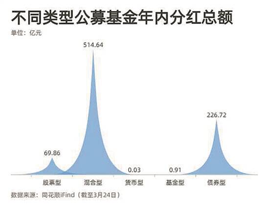 羊城晚报记者 莫谨榕 春节过后,A股市场剧烈振荡,不少公募基金通过分红来调节资产配置。羊城晚报记者据同花顺iFind数据库统计显示,截至3月24日,共有939只公募基金(A/C份额分开计算)进行红利发放,累计分红金额高达812.16亿元。而去年同期,分红的公募基金共有978只,但分红金额总额仅为430.12亿元,从公募基金分红金额上看,今年公募基金分红热情都远超去年,为同期历史之最。 多只网红基金大手笔分红 3月20日,招商基金、工银瑞信基金、博时基金等基金管理人旗下共有20只基金产品发布分红公告。今年以来,A股市场振荡加剧,尤其是春节假期过后调整明显。而近期公募基金分红规模骤增,有业内人士认为,当前市场行情持续振荡,或有部分基金经理通过分红适当降低基金规模,让投资者提前“落袋为安”,基金经理限制申购或进行基金分红,都体现了基金经理对后市看法趋于谨慎。 今年以来基金分红超过800亿元,从基金类型上看,债券基金和主动权益类基金分红力度最大。债券基金分红的数量最多,合计共有600只债券基金参与分红,合计分红总额达到226.71亿元,占分红总额的比例达29.63%。主动权益类基金年内分红总额为480.39亿元,分红规模最大,占分红总额的比例达59.15%。 主动权益类基金分红金额占大头,但是从单只基金的分红金额来看,排在前列的基金的也是主动权益类基金。 从单只基金的情况看,今年以来,146只基金的分红金额超过1亿元,分红规模排在首位的是今年的“网红基金”、由张坤管理的易方达中小盘混合。易方达中小盘混合又限购又分红,一度被投资者解读为张坤谨慎看待后市和控制规模的举措。2月24日,易方达发布公告,易方达中小盘混合自2月24日起暂停申购、转换转入及定期定额投资业务。3月24日,该基金发布公告,继续暂停申购、转换转入及定期定额投资业务。至此,易方达中小盘混合暂停申购已经有1个月余。与此同时,易方达中小盘混合还大手笔分红,2月24日,在发布暂停公告的当天,易方达中小盘也发布了分红公告,每10份基金份额分9元,合计分红规模高达39.48亿元。基金数据显示,这也是易方达中小盘混合成立以来最大手笔的一次分红。 此外,同为网红基金经理的中欧基金周应波管理的中欧时代先锋股票以1月4日为基准日进行分红,分红方案为2.60元/10份基金份额,分红总额超过20亿元;基金老将刘彦春管理的景顺长城新兴成长混合每10份派现金1.7元,分红总额也超过20亿元。 分红总额较高的还有中银丰和定期开放债券、广发聚丰混合A、广发稳健增长混合A、博时主题、南方成份精选混合A、东证睿泽、中欧远见、广发小盘、工银核心价值混合A。今年3月17日,中银丰和定期开放债券发布分红公告,每10份基金份额分红0.506元,分红规模超过22亿元。有业内人士分析,出于对债市风险的考量及满足机构投资者要求,一些规模偏大的债基也会通过分红主动压降规模。 或传递基金经理后市研判 基金分红对基金投资者而言是好事情吗?值得提醒的是,基金分红是指基金将收益的一部分以现金方式派发给基金投资人,这部分收益原来就是基金净值的一部分,因此基金分红当天基金份额净值往往就会下降。基金分红并不能代表基金业绩,基金分红也不会创造新的收益。衡量基金业绩的最主要标准还是其净值增长,投资者不应以基金分红与否来选择是否购买基金,而应该理性面对基金分红。 近期市场波动加大,部分基金通过主动降仓位和分红等方式,锁定部分收益。相比主动降仓位,基金分红能被动降仓位,往往更受投资者的欢迎。业内人士分析,今年以来出现基金分红规模激增主要有多方面原因。首先,春节假期前,A股市场大幅上涨,基金赚钱效益明显,部分基金在经历了2020年的“业绩大年”后,已经积累了一定规模的收益,通过基金分红可以提前将部分收益派发给投资者,提前实现获利兑现,也通过压降规模降低操作风险。 而春节假期后,A股持续调整。也有分析认为,对于基金公司来说,基金分红主要是对市场后续走势不看好。节后以易方达中小盘混合为代表的多只公募基金对基金进行限制申购或采取大手笔基金分红,也被市场人士解读为基金经理对后市看法趋于谨慎。