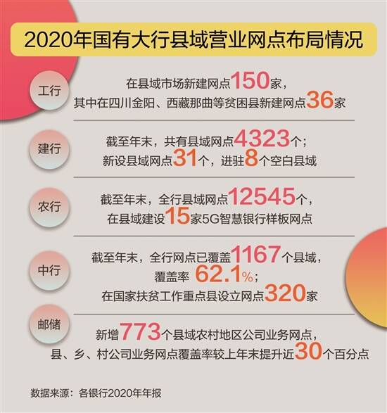 在乡村振兴的政策背景下,一些银行的网点布局也加快向县域倾斜。例如,建行在年报中称,2020年该行完成网点新设63个,其中县域网点31个,进驻8个空白县域;中行在年报中介绍,截至2020年末,本行网点已覆盖1167个县域,覆盖率62.1%;在国家扶贫工作重点县设立网点320家。