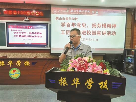 羊城晚报讯 记者陈卓栋,通讯员朱强、谭耀广摄影报道:记者13日从江门鹤山市教育部门方面获悉,近期,鹤山市教育系统通过引进“劳模”“先进”进课堂和走出户外上实践课的形式,进一步培养青少年崇尚英雄、学习模范的精神,引导学生热爱共产党,热爱祖国,热爱家乡的情怀,提升党史学习教育成效。 日前,鹤山宝瑶小学组织学生前往苏维埃革命根据地——宋氏大宗祠,开展 “缅怀先烈,铭记党史”为主题的教育研学实践活动。本次活动的主讲“老师”是原昆东村管理区主任、退休老党员胡浩然,在他的带领下,师生们参观了大宗祠里的每一个展览区。结合现场展板,师生们聆听了有关鹤山县的革命斗争故事,深入地了解革命历史,感悟革命精神,激发同学们对革命先烈的崇尚之情。此外,宝瑶小学还邀请了广东好人、全国离退休干部先进个人、全国关心下一代工作先进工作者李权亨校长到校作“我心目中的五星红旗”为主题的党史教育报告会。 此外,鹤山市振华学校日前也开展“全国劳模宣讲进校园”活动,学校邀请了全国劳动模范冯新源作专题知识讲座。冯新源以一名普通党员的身份和师生们一起学习了党史,并分享了他19年来在雅图仕印刷有限公司干事创业的点滴事迹,表达了作为一名普通党员将积极发扬工匠精神和劳模的示范引领作用,永不放弃,永不退缩的情怀。通过本次活动,劳模精神和工匠精神在师生们心中落地生根。